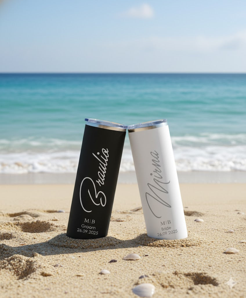 Celebra tu amor con este elegante kit de termos de novios. Dos vasos de acero inoxidable de 20 oz en blanco y negro, perfectos para parejas que desean compartir momentos especiales. Cada termo incluye grabado láser personalizado con el texto que elijas, creando un regalo único y memorable. Mantén tus bebidas a la temperatura ideal mientras llevas contigo un símbolo de tu conexión. Ideales para viajes, picnics o simplemente para disfrutar juntos en casa. Un detalle sofisticado que combina funcionalidad con sentimentalismo.